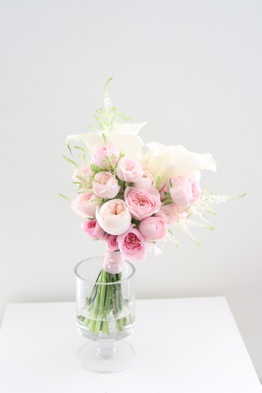 연핑크의 맨스필드 장미와 화이트 카라를 메인으로 사용하였고 아스틸베를 활용하여 싱그러운 느낌을 더했습니다. 여성스러운 느낌의 부케를 원하는 신부님께 추천드립니다.