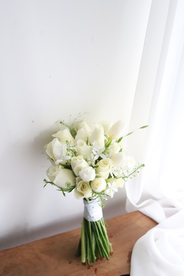 화이트 마릴린먼로 장미와 튤립으로 만든 순백의 부케입니다. 장미와 튤립 사이로 앙증맞은 옥시깍지 넣어 완성도 높은 부케로 제작했습니다. 환하게 나오게 촬영하고 싶은 신부님께 추천 드립니다.