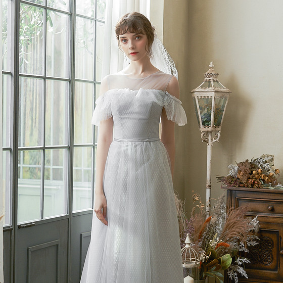 연한 그레이톤의 도트무늬가 돋보이는 튤 소재의 발목 기장감의 롱드레스입니다.