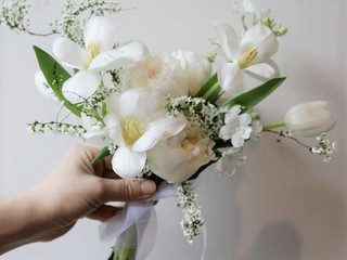 연핑크 장미와 화이트 카라를 믹스한 여성스러운 느낌의 부케입니다.