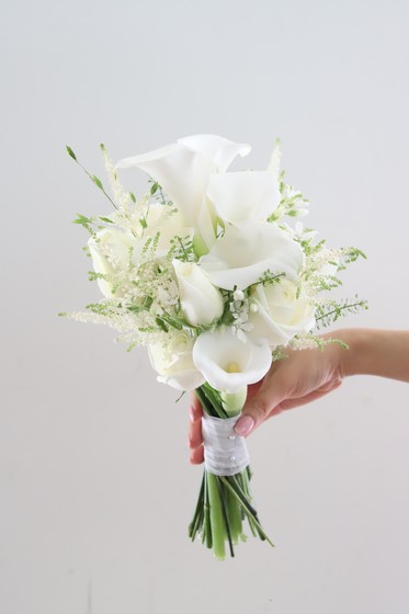 화이트 부케로 깔끔한 카라, 화형이 예쁜 먼로 장미, 그리고 여성스러운 아스틸베로 구성한 부케입니다.